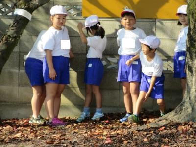 2年生が体育の時間に、色おにをしていました。1人の子が、『〇〇色』と言うと、一斉に子どもたちがその指示された色の所に飛びついて行きます。ちょうど『黒』と言ったので、先生の所に集まっていました。