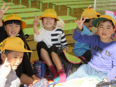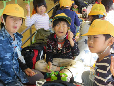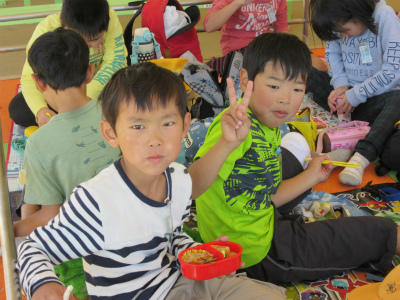 グループ行動を終えた子どもたちが、昼食場所にもどってきました。『お腹がすいた』と言って、どんどん集まってきました。いっぱい動いたので、お腹がすいたようです。
