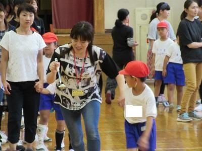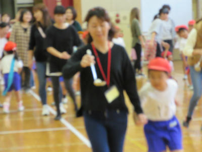 1年生が、学年活動を行いました。お玉とピンポン玉を使ってのリレーでした。親子で協力して楽しそうに走っていました。