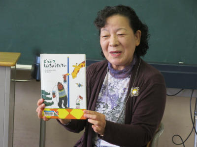 1年生の読み聞かせは、『どうぶつ しんちょうそくてい』のお話でした。かばやゴリラやキリンの身長測定があり、とてもおもしろそうでした。