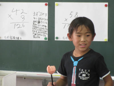 3年生が、少人数指導をやっていました。今日は、2けた×1けたの計算で、答えが3けたになる計算をしていました。自力解決も、しっかり頑張っていました。