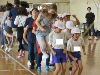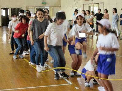 今日、5年生は親子での学年活動でした。大縄を使って、何回跳べるか競技していました。最初に、女の子と保護者、次の男の子と保護者で跳びました。