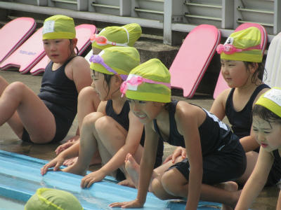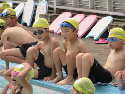 1年生が、5時間目に水泳学習を行っていました。先生の指示に従って、楽しそうに活動していました。友達に水をかけながら、楽しそうにやっていました。