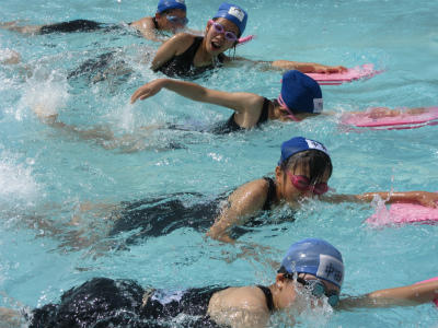 6年生は、2度目の水泳学習でした。今日は、自由形に集中して手のかきと息継ぎについて頑張って取り組んでいました。腕を枕にしてやるんだよ!というアドバイスに、少しずつできるようになっていました。