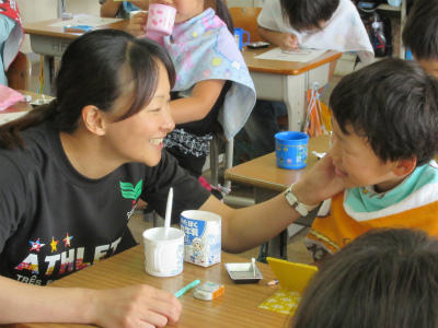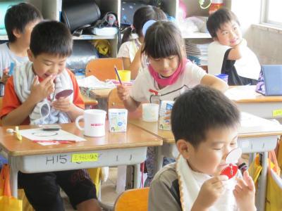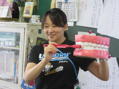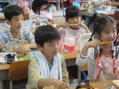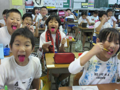 6月のむし歯予防デーにちなんで、各クラスとも養護の先生が歯みがき指導をしています。4年生は、カラーテスターをつけて、みがけていない所をしっかりチェックしていました。