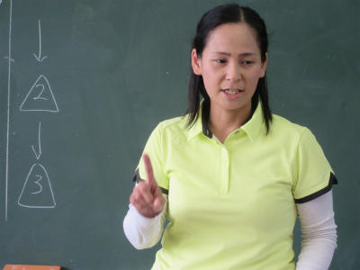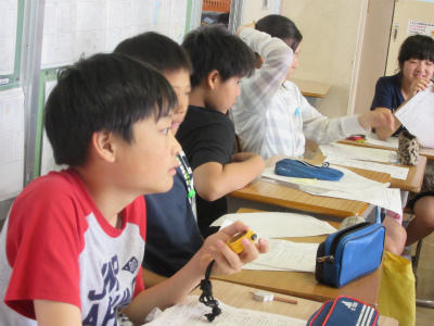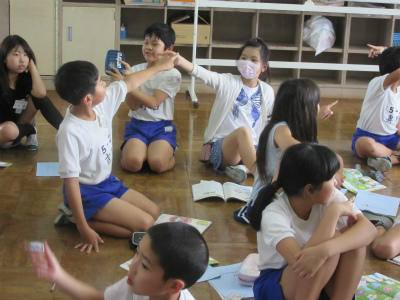 5年生が、外国語学習で、△や〇、◇や□などを探すゲームをしていました。色と形を指定してどの番号かを当てるゲームをしていました。