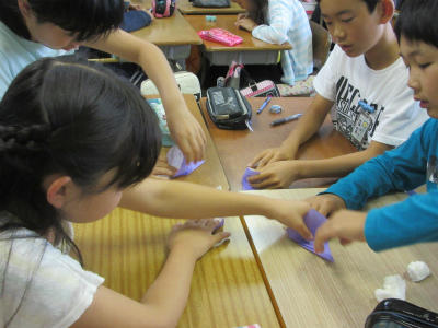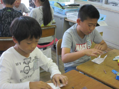 5年生も、人権教育集会に向けて、折り鶴を折っていました。分かっている女の子がリーダーになって、男子に教えていました。