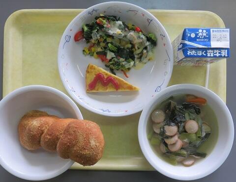 本日の献立は、はちみつパン、鮭のマヨネーズ焼き、ミネストローネ、グリーンサラダ(玉ねぎドレッシング)、牛乳でした。
