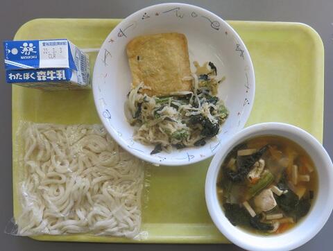 本日の献立は、五目うどん(地粉うどん)、かしわ天、切り干し大根の和え物、牛乳でした。