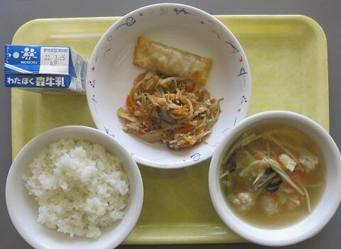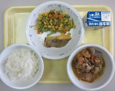本日の献立は、ご飯、焼きチキンナゲット、切り干し大根の煮物、いももち汁、牛乳でした。