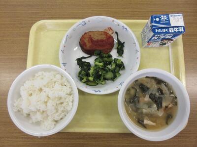 本日の献立は、ご飯、ほきのもろみ焼き、青菜のおひたし、すき焼き風煮、牛乳でした。