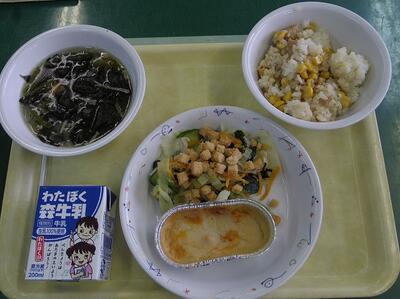 本日の献立は、コーンピラフ、鮭のごまマヨネーズ焼き、コンソメスープ、グリーンサラダ(野菜いっぱいドレッシング)、牛乳でした。