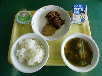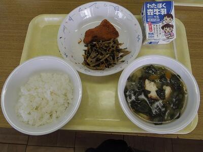 本日の献立は、桜川小学校の給食委員会が考えた献立だそうです。わかめご飯、かぼちゃコロッケ、五目きんぴら、豚汁、牛乳でした。