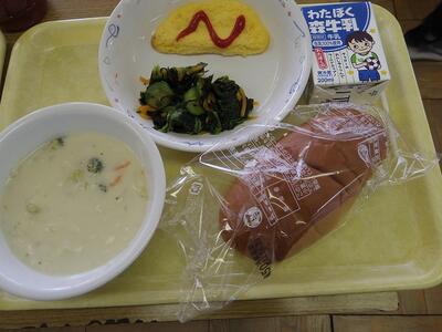 本日の献立は、ソフトフランスパン+チョコクリーム、ソースたっぷりチキン、クラムチャウダー、ビーンズサラダ(ソイドレッシング)、牛乳でした。