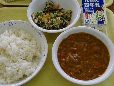 本日の献立は、カレーライス(麦ご飯)、ツナサラダ(ノンオイルごまドレッシング)、ピーチゼリー、牛乳でした。