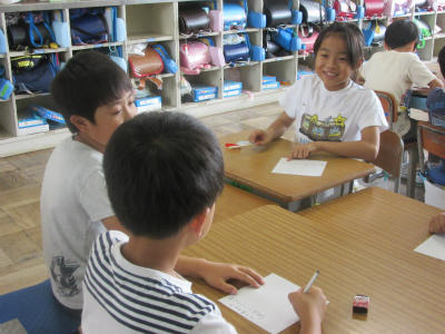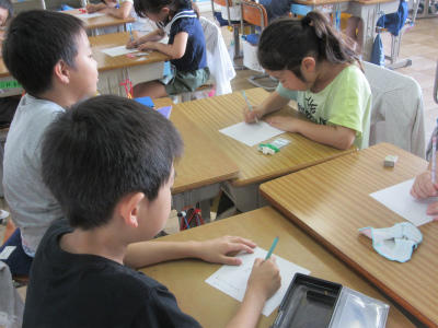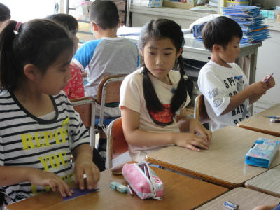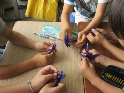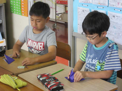 同じ時間に、3年生も折り鶴を折っていました。1つ1つ折る所を教わりながら、進めていました。完成すると、とても喜んでいました。