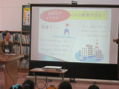 4年生が、環境学習講座を行いました。市役所の方から、環境学習についてお話を聞きました。地球温暖化のことやゴミの量など、たくさんの話を聞くことができました。