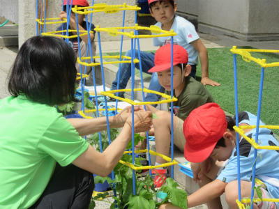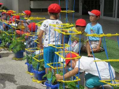 1年生が、あさがおの観察をしていました。葉っぱが10cmくらい大きくなり、子どもたちがビックリしていました。しっかり観察ができましたね。