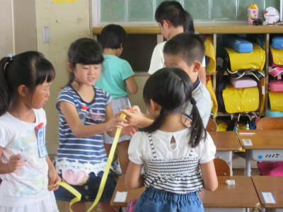 1年生が紙テープを使って、長さ比べをしていました。机のたてとよこ、どっちが長いのか?鍵盤ハーモニカの入れ物のたてとよこ、どっちが長いのか?、グループごとに、仲よくしっかりやっていました。