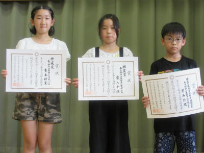 今朝は、表彰朝会でした。主に硬筆展と体育関係の表彰を行いました。硬筆展では、校内硬筆展・市内硬筆展・県展と3つの表彰をしました。