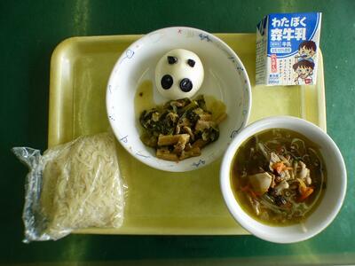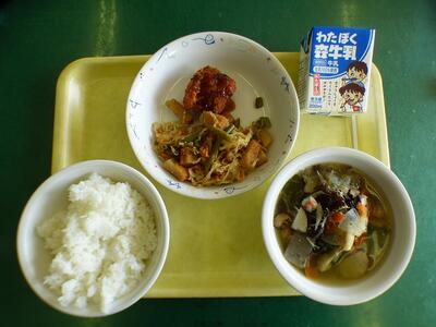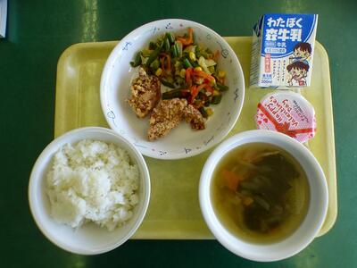 本日の献立は、ツイストパン、タンドリーチキン、ラビオリスープ、カラフルサラダ、ノンオイルごまドレッシング、牛乳でした。