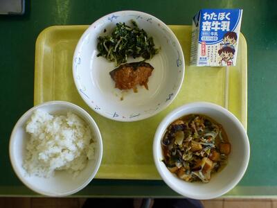 本日の献立は、五目寿司、さわらの西京焼き、花かまぼこのすまし汁、青菜のおひたし、ひなあられ、牛乳でした。