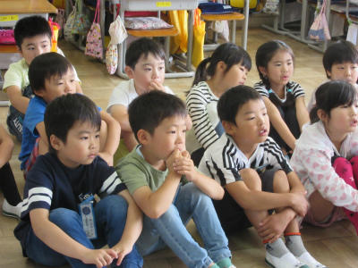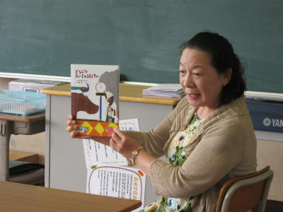 1年生も、だいぶ学校に慣れて、月曜日の読み聞かせを楽しみにしていました。本を読んでくれる方と約束をしていて、その本の紹介をしていました。