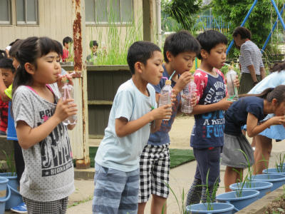 4年生が、理科の『水と空気』で、空気を送り込むことによって、水が出る実験をやっていました。空気が縮められて、水の出るしくみが分かってとても楽しそうでした。
