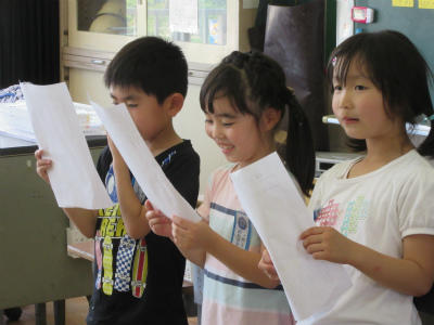 1年生も、だいぶ学校に慣れて、月曜日の読み聞かせを楽しみにしていました。本を読んでくれる方と約束をしていて、その本の紹介をしていました。