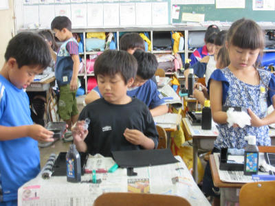4年生が、空気でっぽうの実験をやっていました。空気が縮められて、その力ではさんでいるものが飛び出すので、とても楽しいですね。