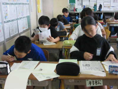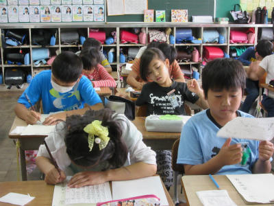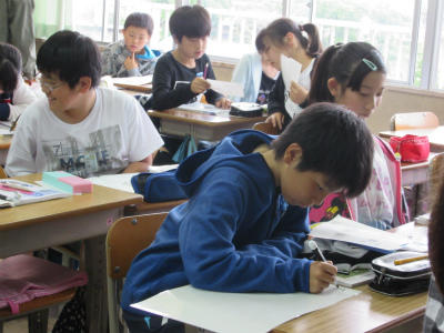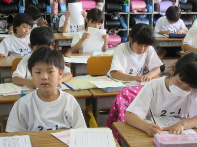 校内硬筆展が一斉に行われました。クリーム色の清書用紙に集中して頑張っていました。明日の廊下掲示の賞が楽しみですね。