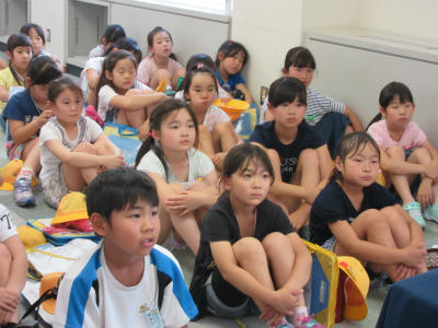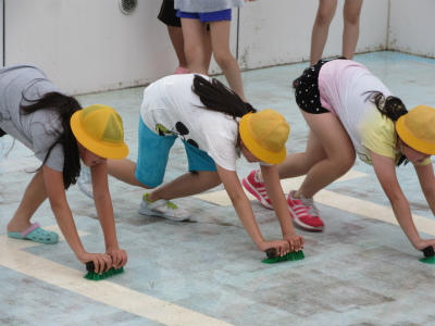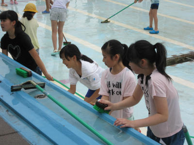 6年生が、最初はまじめにプール掃除をしていました。そのうちに、プールではないところに水をかけていました。とにかく、全員でしっかりきれいに取り組んでいました。
