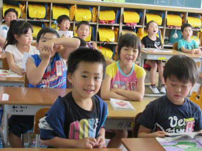 1年生の教室の方から、元気な歌声が聞こえてきました。動作を交えながら、大きな声で歌を歌っていました。とても楽しそうですね。