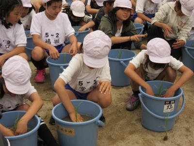 1つのバケツに、2本の苗を植え付けていきました。稲は、水の管理が重要ですので、明日からしっかり気にしてやってください。