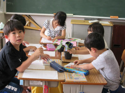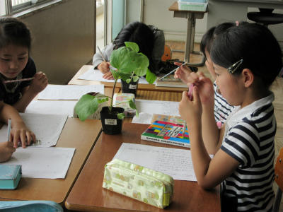 2年生が、野菜の苗の観察をしていました。ミニトマトは、全員で植えたので、別のなすやピーマン、おくら、きゅうりなどの苗を観察していました。