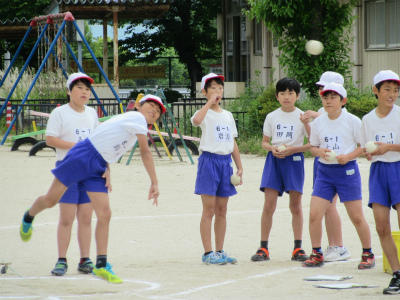 5年生と6年生も、新体力テストを行っていました。今日は、50m走とボール投げの記録を取っていました。50m走では、7秒台の児童もいたようです。