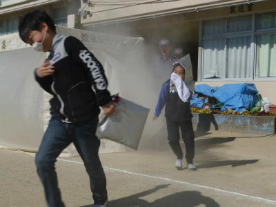 職員は、消化器を使った消火訓練、2年生、4年生は、煙体験を行いました。