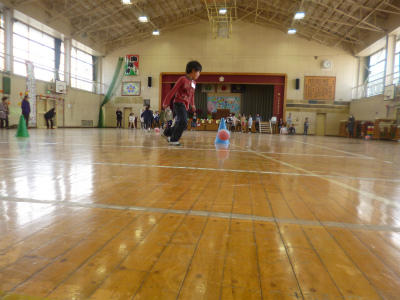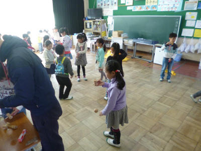 1年生は、けん玉、あやとり、こま回しの遊びを体験しました。