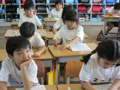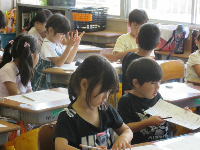今日は、チャレンジタイム・算数でした。1年生は、10は4と6、10は5と5、10は7と3……をやっていました。これから、計算するヒントになりました。