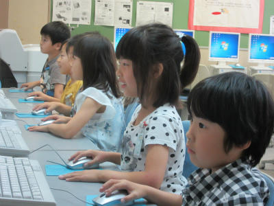 2年生になって初めてのパソコン学習をしていました。ゲームを通して、マウスの使い方を覚えているようでした。楽しそうにやっていました。ボランティアの大学生の人に教わって勧めていました。