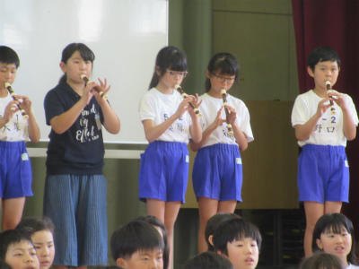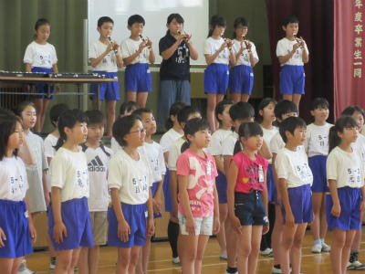 5年生が、来週行う音楽朝会の合唱の練習をしていました。『はじめの一歩』の歌を、少しだけ楽器を入れて綺麗な歌声を響かせていました。