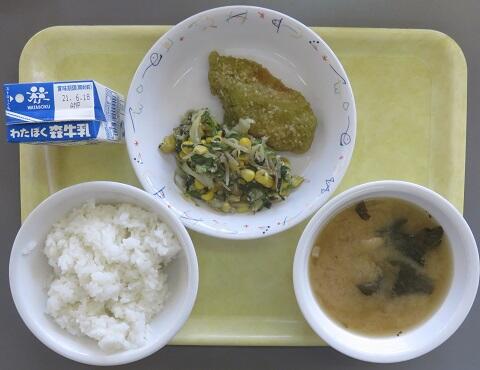本日の献立は、ご飯、カレイの抹茶揚げ、野菜のごま醤油和え、味噌けんちん汁、牛乳でした。カレイの衣には、狭山茶の抹茶が入っています。お茶の香りを味わうため、衣に塩味をつけていて、ソースは使いません。