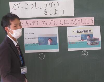 支援学級では、chromebookを使って学校紹介のプレゼンテーションをつくっていました。今日は、前回つくった画面を、よりパワーアップさせて発表しようということで、字を大きくしたり、字の色を変えたりしながら、パワーアップした画面をつくっていました。