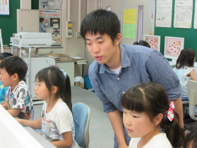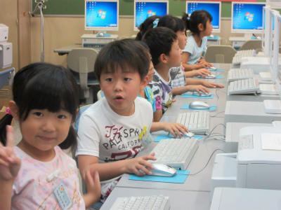 2年生になって初めてのパソコン学習をしていました。ゲームを通して、マウスの使い方を覚えているようでした。楽しそうにやっていました。ボランティアの大学生の人に教わって勧めていました。