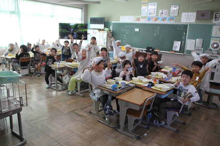 2年生の給食の様子です。今日の献立は、ご飯、牛乳、酢豚、バンサンスーです。おいしくいただきます。