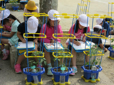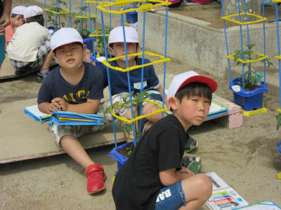 2年生が個人の鉢に、ミニトマトを植えました。1人1人が自分のミニトマトをしっかり観察していました。大きく生長するといいですね。