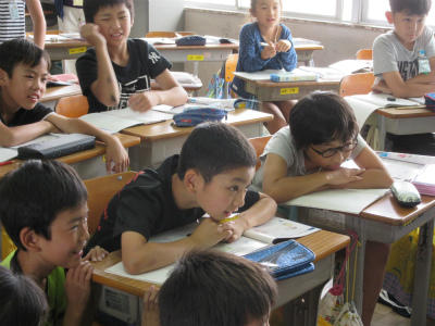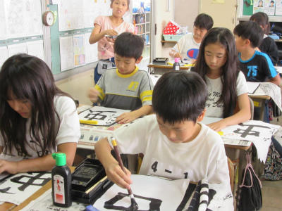 4年生は、書写のクラスと理科の実験をやっているクラスでした。『虫』という字をしっかり書いていました。理科では、空気でっぽうの空気の働きを調べていました。
