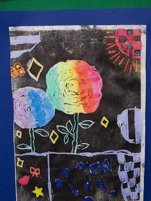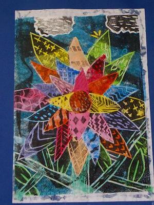 4年生が版画に挑戦しました。「彫ってあらわす不思議な花」という題材だそうです。