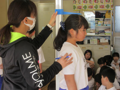 保健室で、4年生が発育測定をしていました。身長は1mmでも高く、体重は1kgでも軽くという感じで測っていたようです。休み中に、どの子も大きくなりました。
