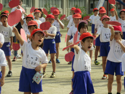 紅白応援合戦の練習がありました。紅組の応援は、とても大きな声が出ていました。団長を中心によく頑張っていました。